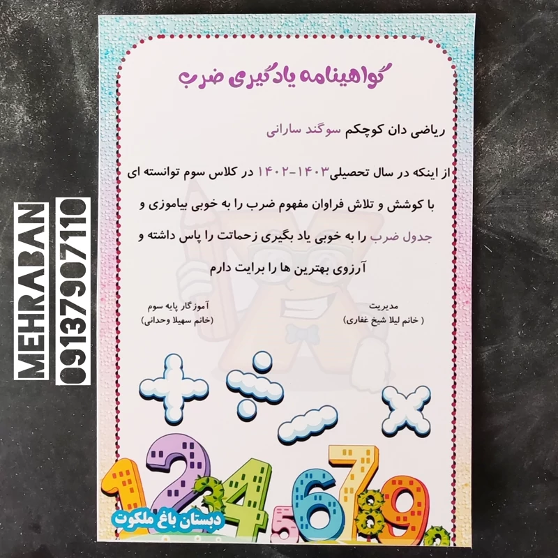 گواهی حفظ جدول ضرب ویژه کلاس سومی ها همراه با تایپ اسامی دانش آموزان و مدیر و معلم ،یک عدد