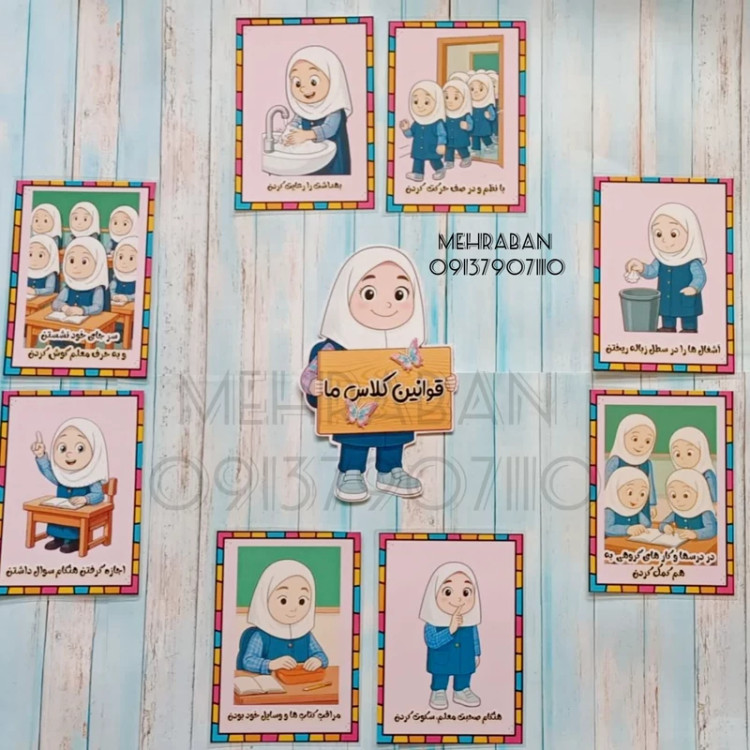 تعداد 9برگ آ5یا آ4به انتخاب خودتون براتون به صورت لمینت شده ارسال میشه ،شما هر تمه رو با سلیقه خودتون روی دیوار یا برد کلاس میچسبونید